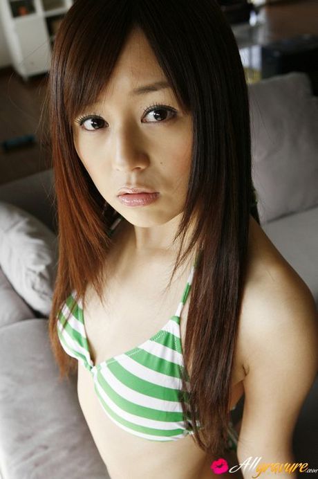 All Gravure: Alluring asian babe taunts in her green and white bikini