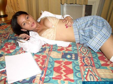 Little Brown Fucking Machines: Cute broad stripping on the bed to show a yummy pink love hole