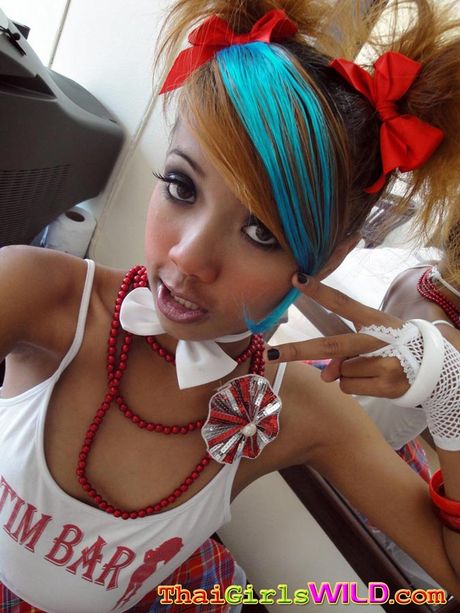 Thai Girls Wild: Emo chick Air exposes her shaved Thai pussy befoee some creampie action