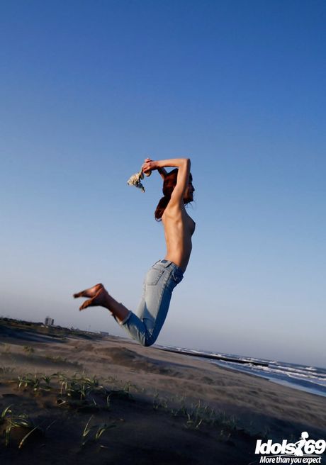 Idols 69: Hot japanese teen Yu Satome in jeans shows big hooters and sexy butt at beach
