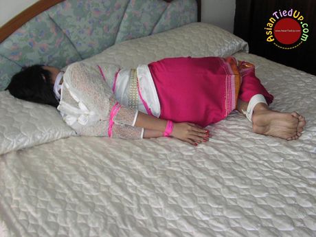 Asian Tied Up: Japanese lady strips off and bares her tiny tits and pussy