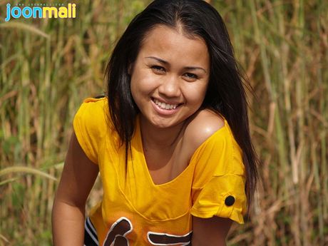Joon Mali: Petite brown Joon Mali shows her smooth shaved landing strip